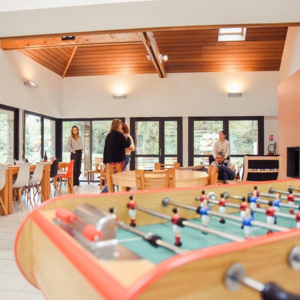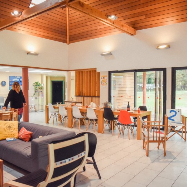 Au cœur du bâtiment, entièrement de plain-pied, se trouve un espace commun de 80 m² conçu pour partager des repas conviviaux ou se détendre en soirée. La cheminée, particulièrement bienvenue à l’automne lorsque le froid arrive, crée une ambiance chaleureuse idéale pour lire un livre ou savourer un apéro. Grâce aux larges baies vitrées, profitez d’une lumière naturelle éclatante dès le matin, tout en admirant une vue imprenable sur la végétation environnante, offrant un cadre paisible et ressourçant.
